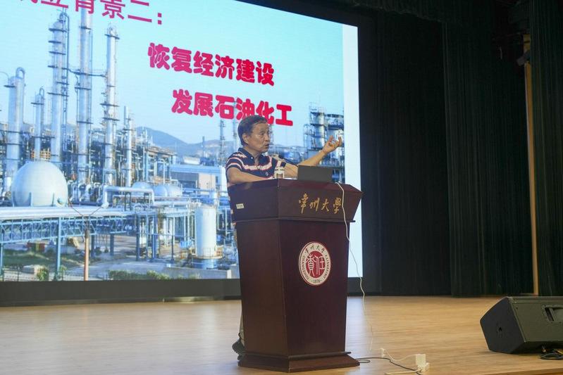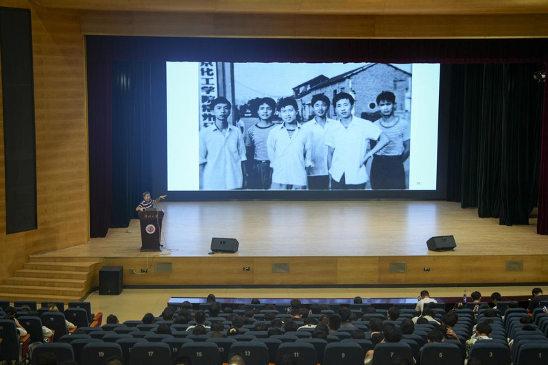 讲座中,袁能以“常大首届学子”身份切入,结合社会历史背景,用校史图片与文字记录,梳理学校发展脉络。他详细回顾了学校初创时期艰苦奋斗的办学历程,以及近年来在教学改革、科研创新、社会服务等领域取得的显著成果,重点介绍了学校在石油化工学科建设及产学研合作方面的突破。期间,袁能通过展示珍贵校史图片、分享鲜活的优秀校友事迹,让新生直观感受到学校的发展脉络与精神传承。