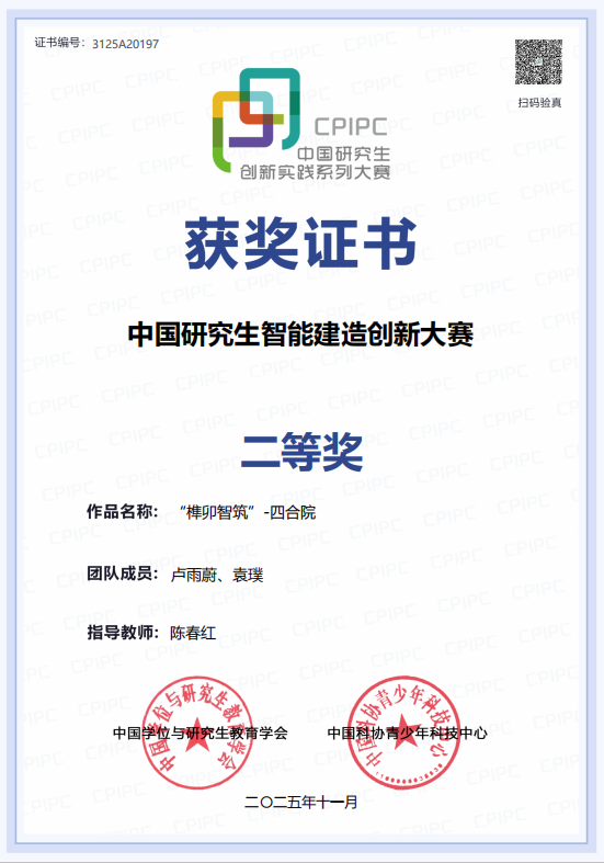 2025年11月30日,首届中国研究生智能建造创新大赛在南通国际会议中心圆满落幕。由日本成人视频 研究生卢雨蔚担任项目负责人,队员袁璞协同参与,陈春红老师担任指导教师的团队,凭借作品《榫卯智筑-四合院》在决赛中表现优异,荣获全国二等奖,展现了学院在智能建造领域的创新实力与人才培养成果。